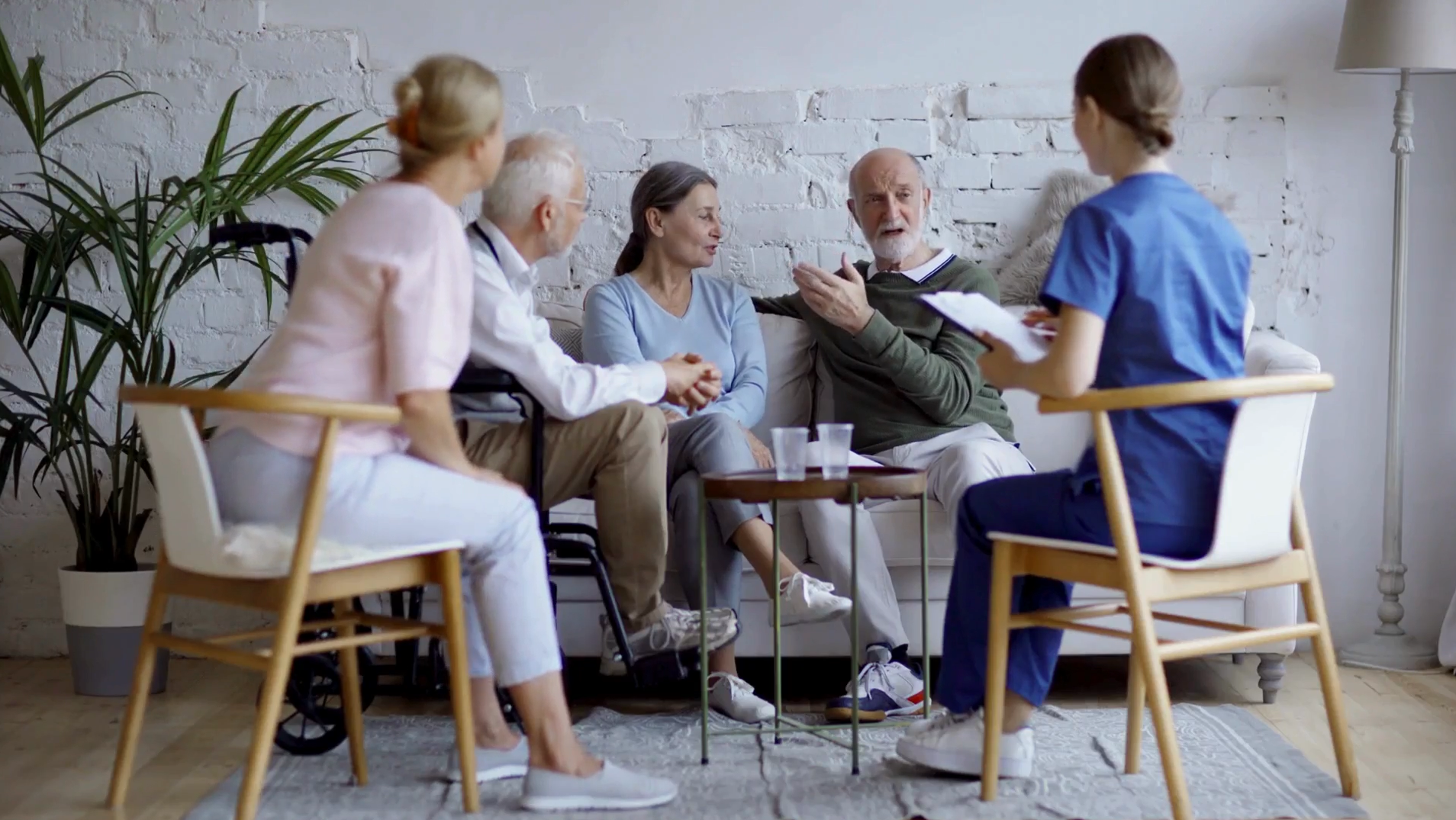 Two nurses talking to a senior couple